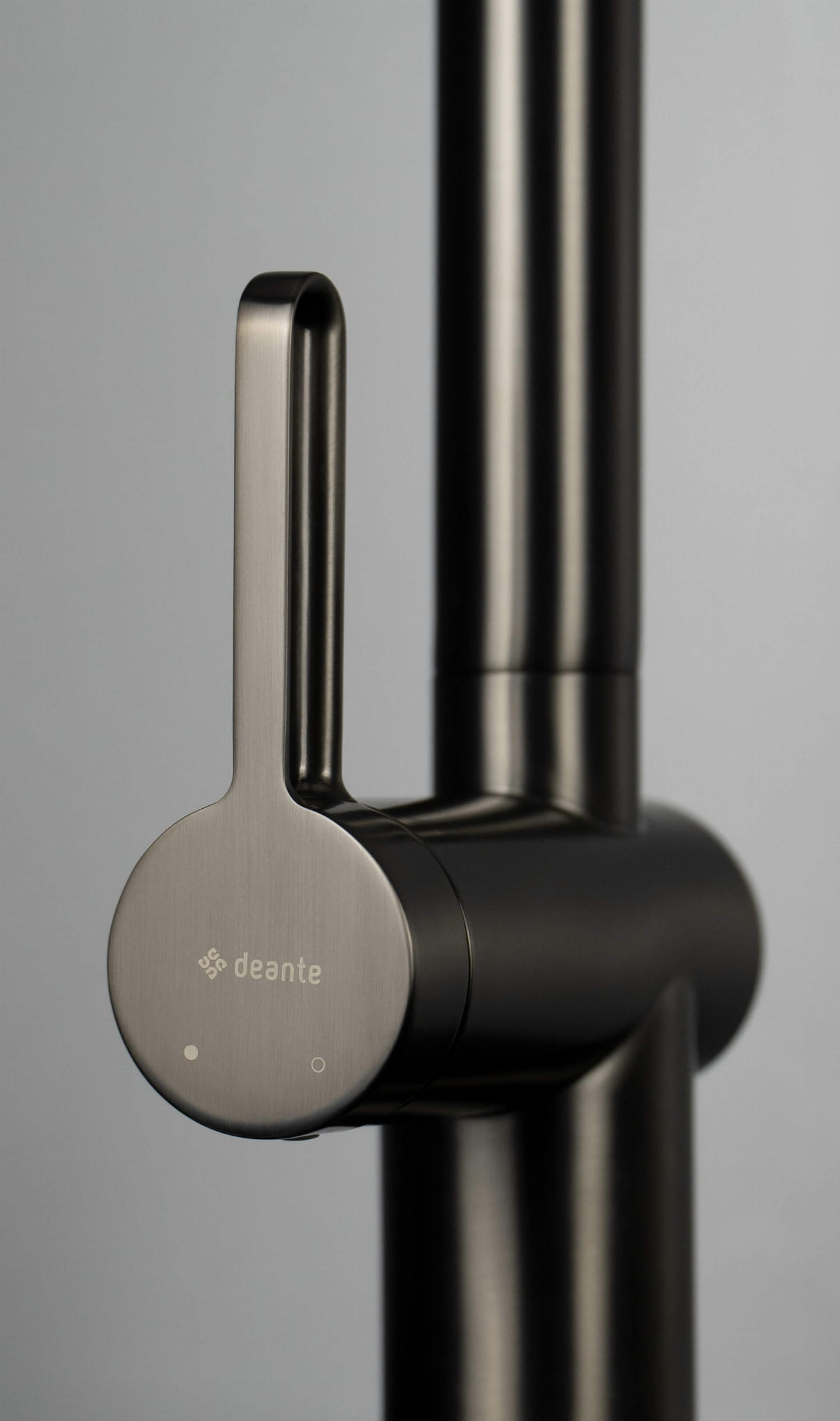 Bateria kuchenna stojąca z elastyczną wylewką z dwoma rodzajami strumienia Magnetic firmy Deante w kolorze titanium.