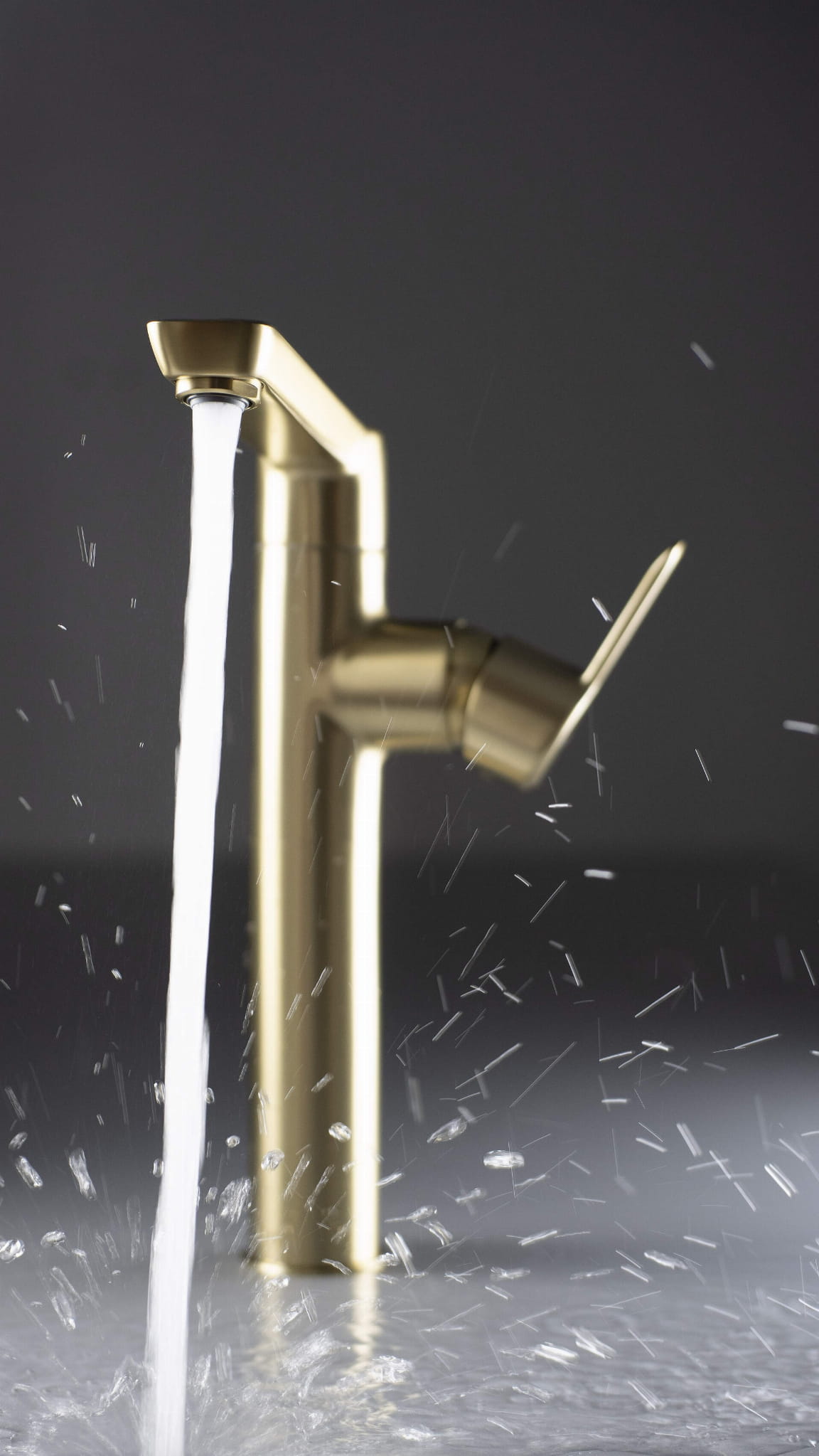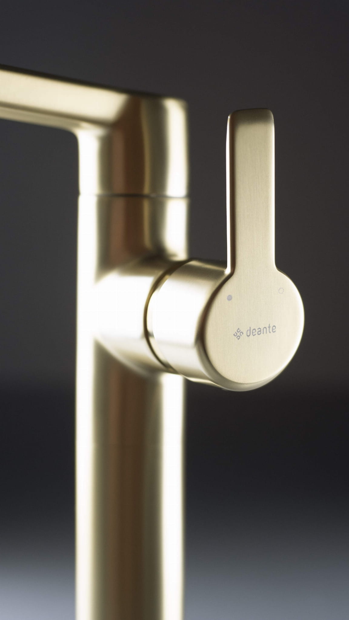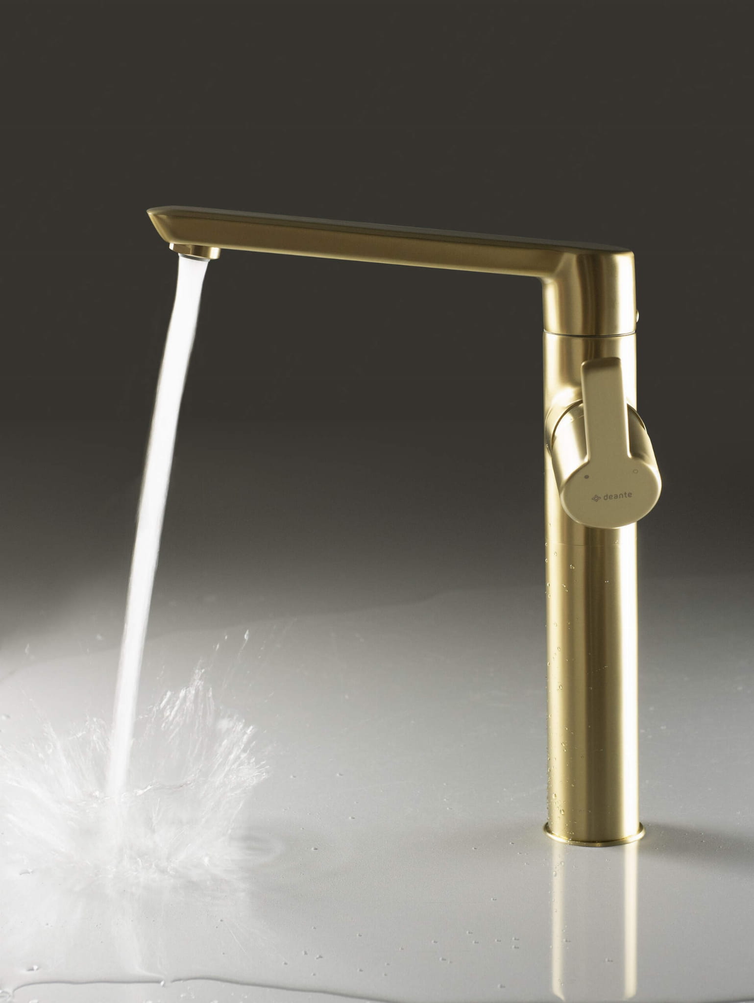Bateria umywalkowa stojąca wysoka Arnika firmy Deante w wykończeniu szczotkowanego złota.