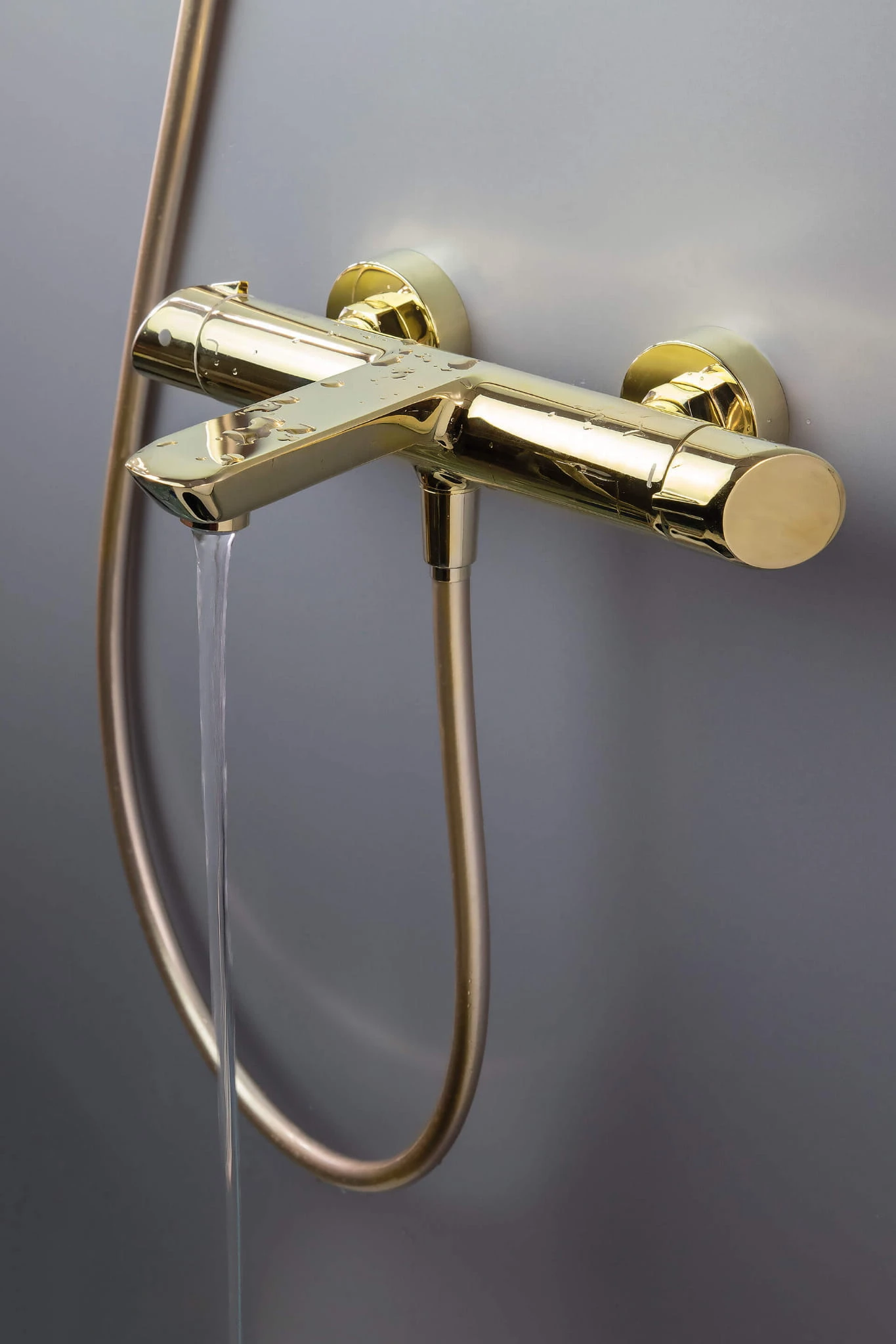 Dwuuchwytowa bateria wannowa Arnika Deante w kolorze złotym to eleganckie i stylowe rozwiązanie dla Twojej łazienki. Jej harmonijna forma i obły kształt wyróżniają ją na tle innych baterii, dodając przytulności i ciepła aranżacji wnętrza. Złote wykończenie doskonale komponuje się zarówno z białą ceramiką, jak i innymi elementami wyposażenia łazienki.