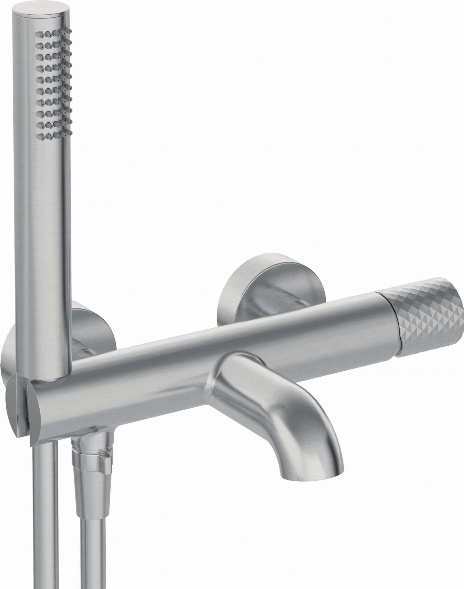 Bateria wannowa ścienna z zestawem prysznicowym Silia Hexa firmy Deante w kolorze szczotkowanej stali.