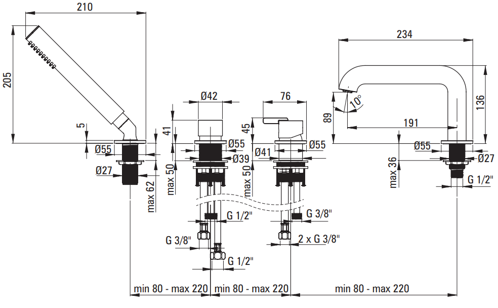 Bateria wannowa 4-otworowa brąz szczotkowany Silia Deante