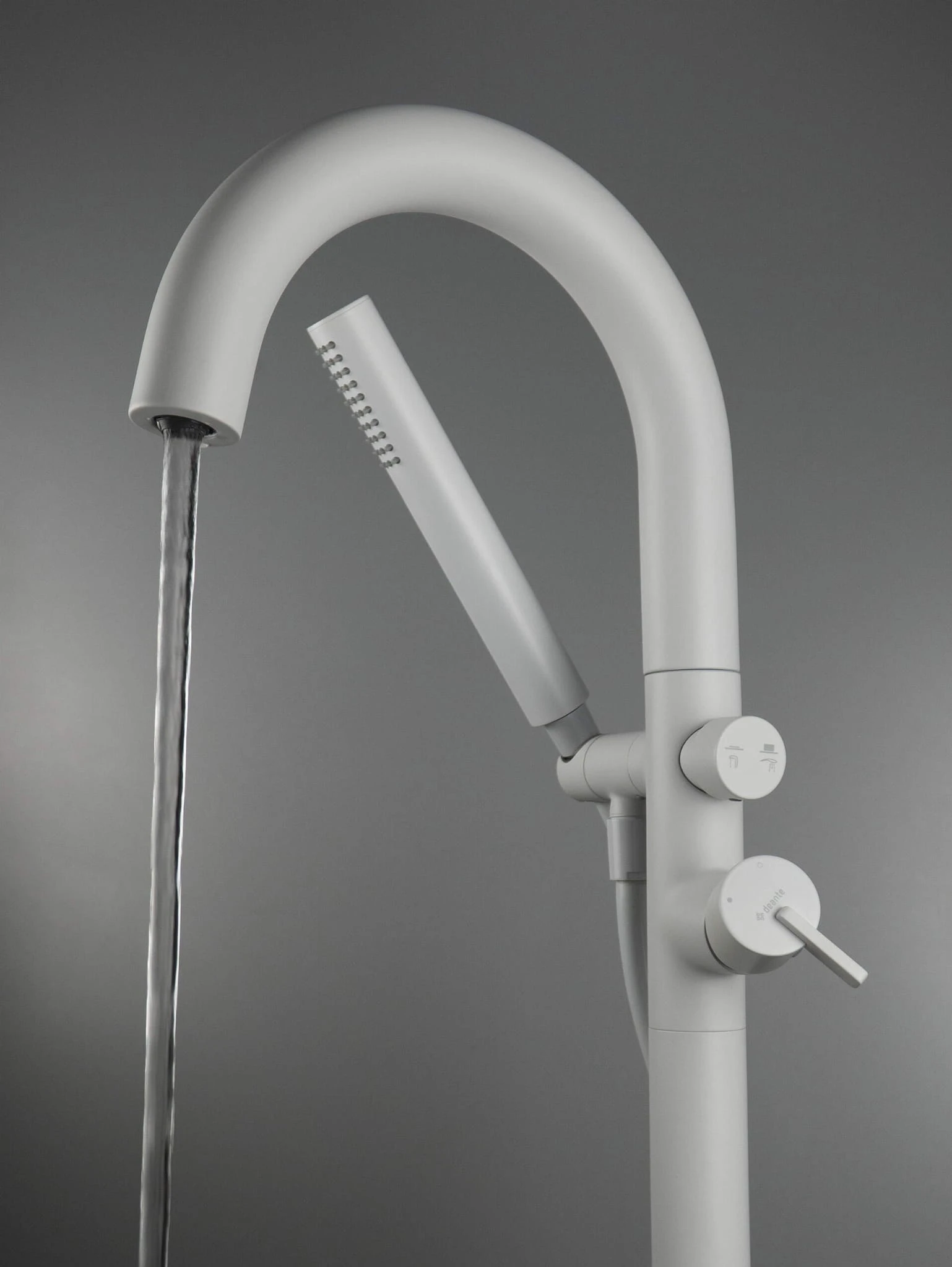 Bateria wannowa wolnostojąca z zestawem prysznicowym Siia firmy Deante w białym wykończeniu.