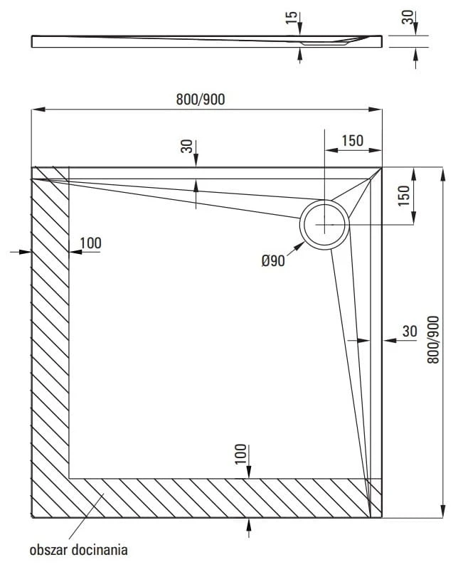 - Możliwość docinania brodzika Kerria Plus. Możemy dowolnie dopasować kształt brodzika Kerria Plus poprzez jego docięcie, aby w pełni wykorzystać potencjał łazienek o nietypowych kształtach czy wymiarach. Precyzyjne docinanie umożliwia stworzenie wyjątkowej przestrzeni kąpielowej także w niewielkich łazienkach. Docinamy tylko obszar zaznaczony na rysunku technicznym, a do tego celu zalecamy użycie wyrzynarki. Odciętą powierzchnię należy zabezpieczyć silikonem.
