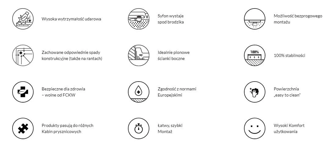Montaż brodzików z serii Protos jest szybki i prosty, może wykonać go samodzielnie jedna osoba. Brodzik można zamontować bezprogowo (rozwiązanie to docenią wszyscy użytkownicy, a szczególnie seniorzy lub osoby z ograniczeniami ruchowymi). Powierzchnia o białej kamienistej strukturze (RAL 9003; klasa antypoślizgowa „A” zgodnie z DIN 51097) zapewnia komfort użytkowania i zmniejsza ryzyko upadków spowodowanych poślizgnięciem. Seria ta idealnie wpasuje się do każdej przestrzeni łazienkowej ponieważ istnieje możliwość docięcia brodzika do odpowiedniego wymiaru.