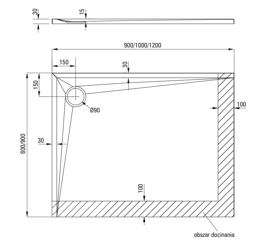 - Możliwość docinania brodzika Kerria Plus. Możemy dowolnie dopasować kształt brodzika Kerria Plus poprzez jego docięcie, aby w pełni wykorzystać potencjał łazienek o nietypowych kształtach czy wymiarach. Precyzyjne docinanie umożliwia stworzenie wyjątkowej przestrzeni kąpielowej także w niewielkich łazienkach. Docinamy tylko obszar zaznaczony na rysunku technicznym, a do tego celu zalecamy użycie wyrzynarki. Odciętą powierzchnię należy zabezpieczyć silikonem.