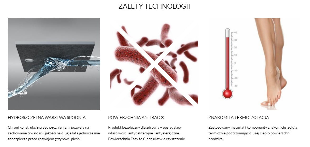 Materiał: kompozyt Stonicryl® wielowarstwowy kompozyt wzmacniający konstrukcyjnie dno i ranty brodzika, dostępny w wersji gładkiej o wysokim połysku lub z matowym efektem mineralnym (kamienista struktura powierzchni)