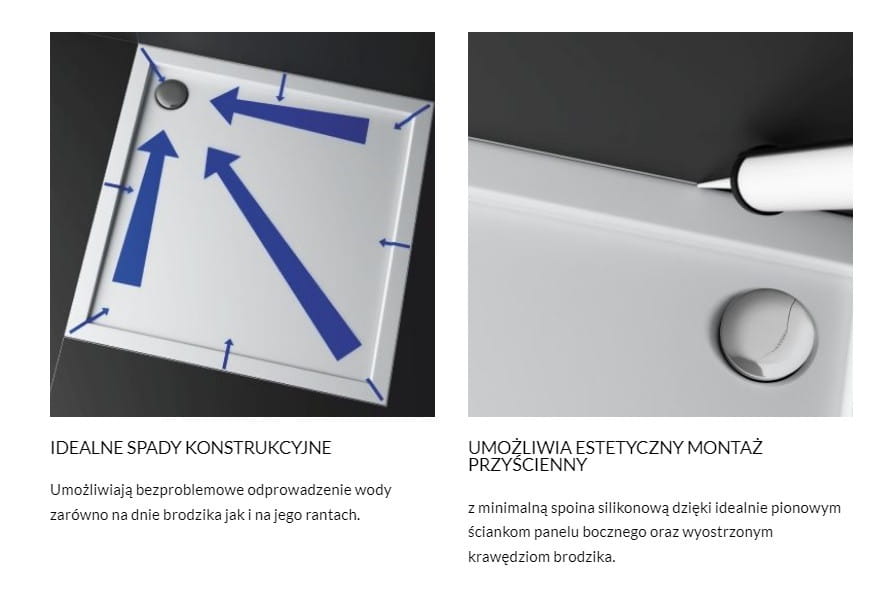 Z minimalną spoina silikonową dzięki idealnie pionowym ściankom panelu bocznego oraz wyostrzonym krawędziom brodzika.