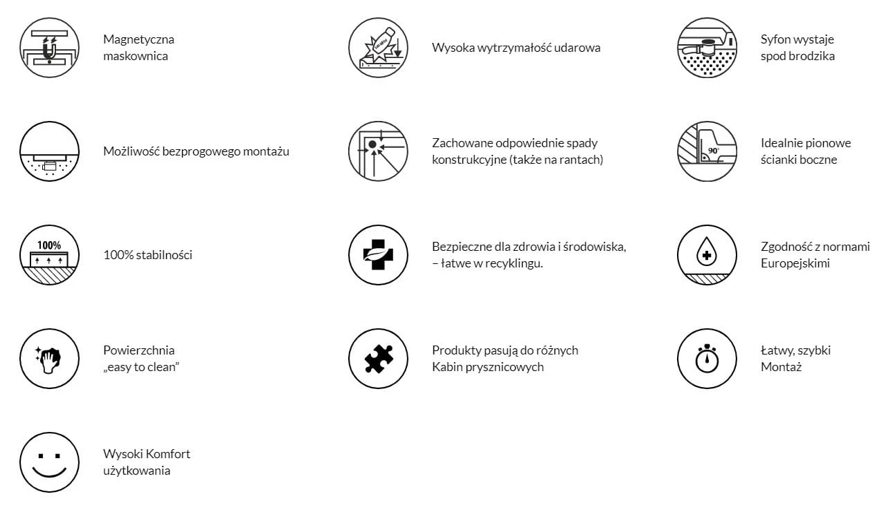 Materiał: kompozyt Stonicryl®, wielowarstwowy kompozyt wzmacniający konstrukcyjnie dno i ranty brodzika, dostępny w wersji gładkiej o wysokim połysku