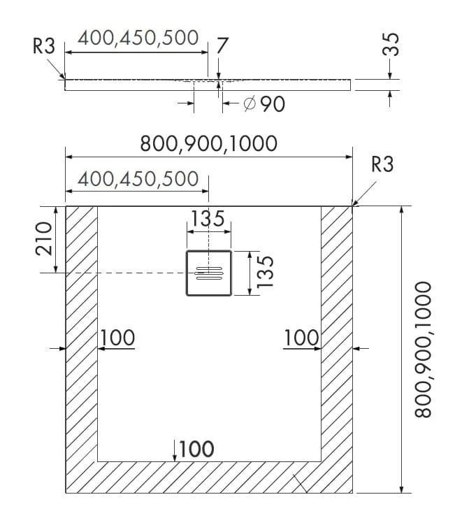 Brodzik kwadratowy PROTOS CASHMERE STONE 100x100 Schedpol Schedline, kaszmir - odpływ środek