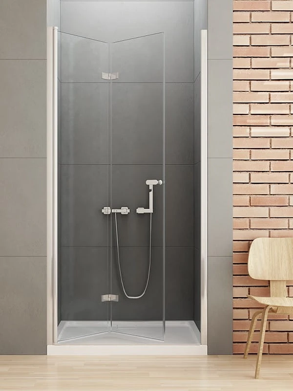 Drzwi prysznicowe pojedyncze składane. Zawias kolumnowy zastosowany w drzwiach NEW SOLEO zapewnia niezwykle szerokie wejście.
