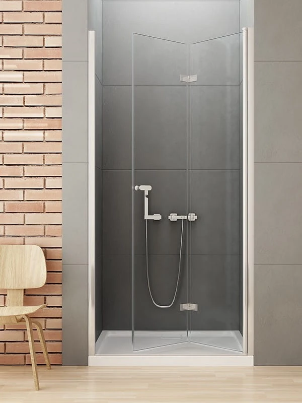 Drzwi prysznicowe pojedyncze składane. Zawias kolumnowy zastosowany w drzwiach NEW SOLEO zapewnia niezwykle szerokie wejście.