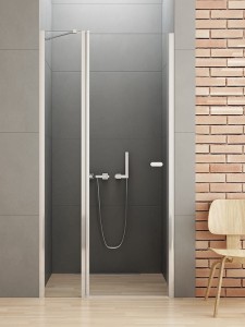 Drzwi prysznicowe pojedyncze otwierane na wewnątrz i do wewnątrz. Zawias kolumnowy zastosowany w drzwiach NEW SOLEO zapewnia niezwykle szerokie wejście.