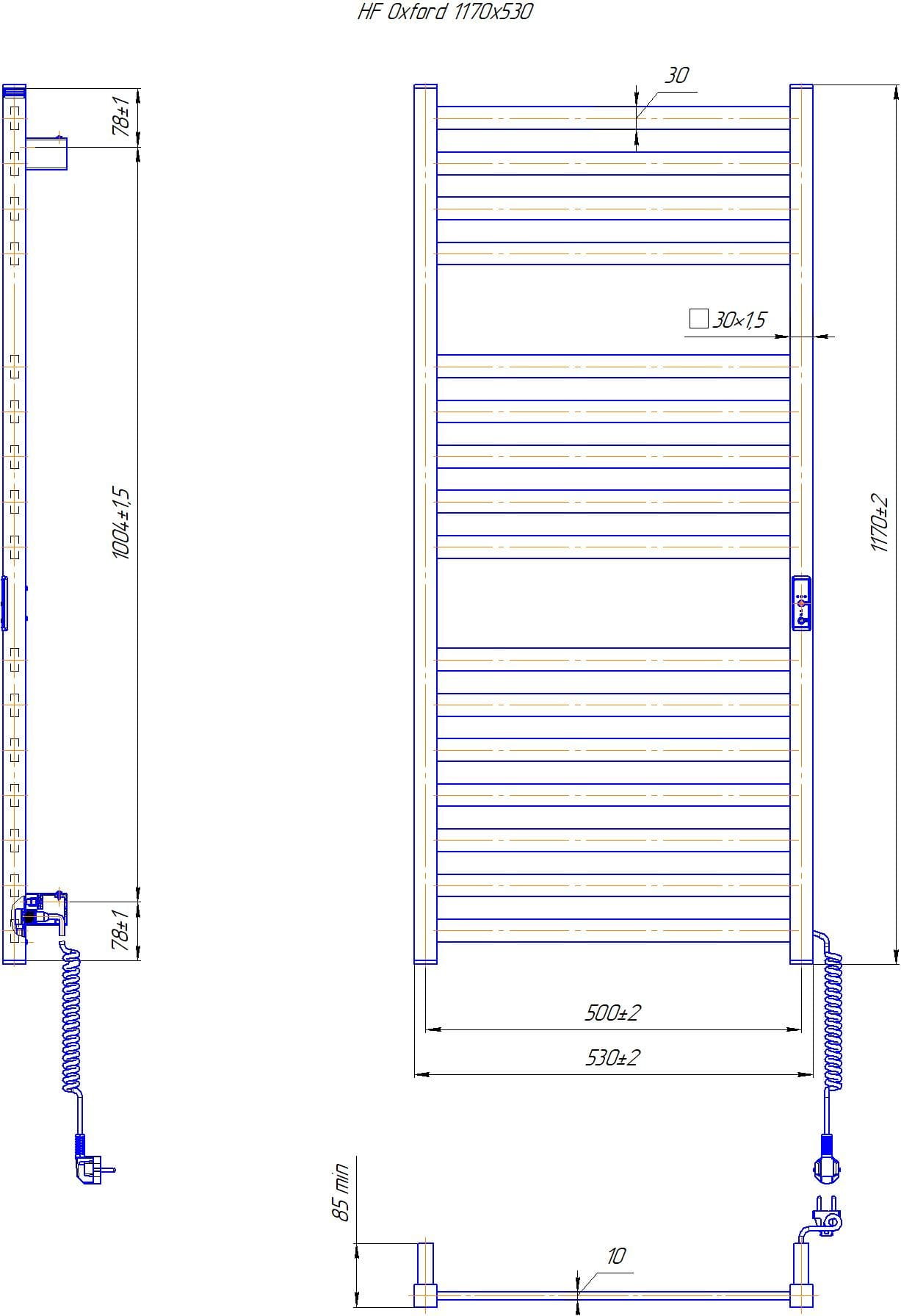 Prosta drabinkowa suszarka elektryczna na ręczniki model HF Oxford, zbudowana jest z pionowych profili kwadratowych 30x30 mm oraz poziomych profili prostokątnych 30x10 mm. Przerwy między poziomymi sekcjami umożliwiają swobodne rozmieszczenie wilgotnych ręczników i ubrań.