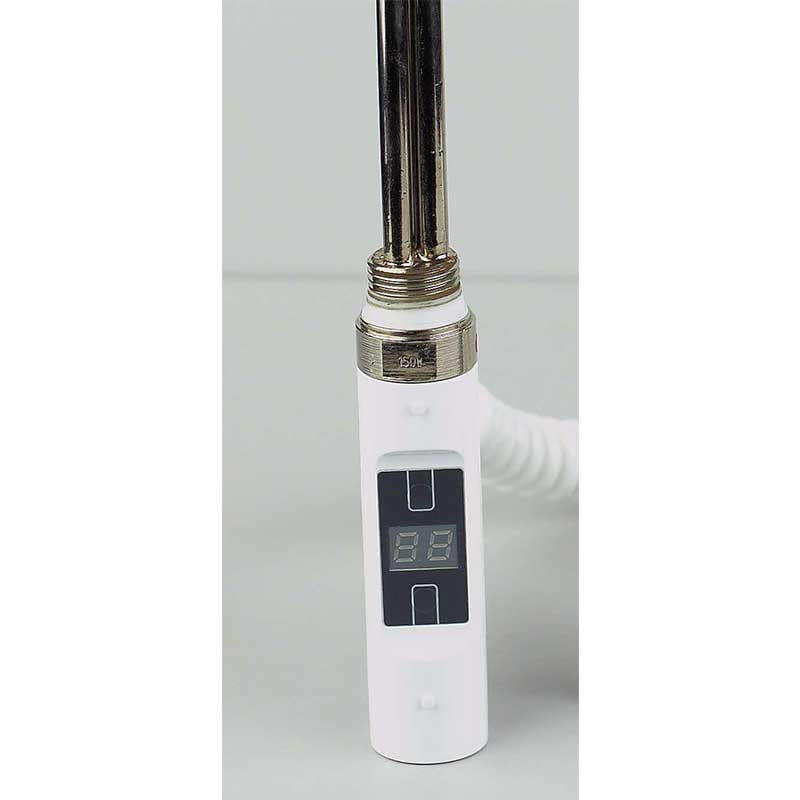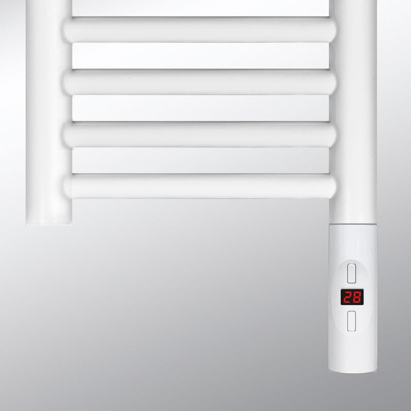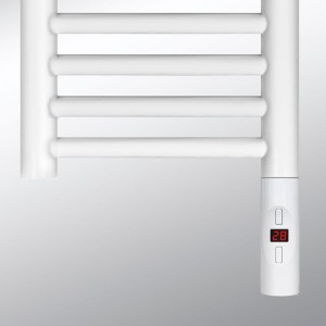 Model H+E z wyświetlaczem, regulacją temperatury wody 10-65°, trybem Turbo 1/2/3 godziny, rozłącznym elementem grzejnym. Dostępna z odpowiednią nakładką maskującą dostosowującą grzałkę do kształtu kolektora grzejnika oraz zakryte podłączenie do ściany.