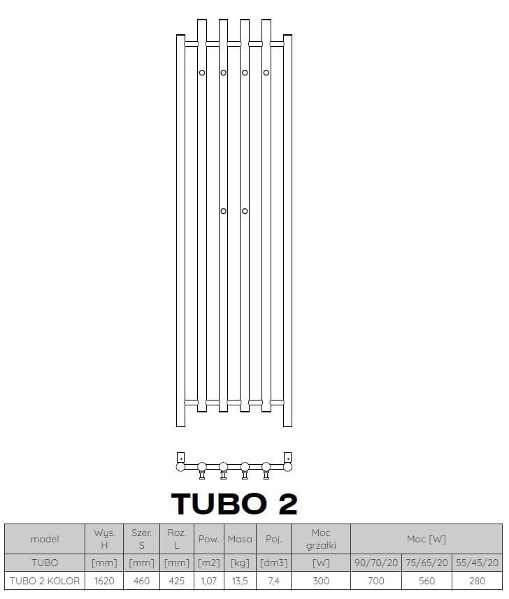 Grzejnik to jeden z najważniejszych elementów każdej łazienki. Nie tylko utrzymuje w pomieszczeniu odpowiednią temperaturę, ale pełni także funkcję dekoracyjną oraz jest wykorzystywany jako suszarki na wilgotne ręczniki. Grzejnik Tubo idealnie wpasuje się w wąskie przestrzenie, dzięki swojej smukłości. Może zostać wykonany na zamówienie w kolorach palety barw RAL oraz palety barw strukturalnych Radeco. Dostępne kolory są pokazane w zdjęciach.