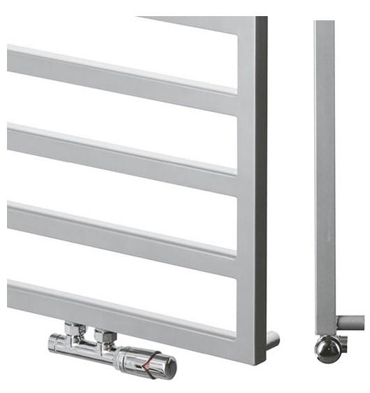 Zdjęcie główne przedstawia grzejnik w kolorze Merkury 3 wraz z zestawem zaworów Duoplex chrom.