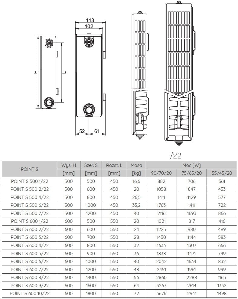 Grzejnik Point S ma podłączenie dolne 50 mm, tylko w prawej strony.