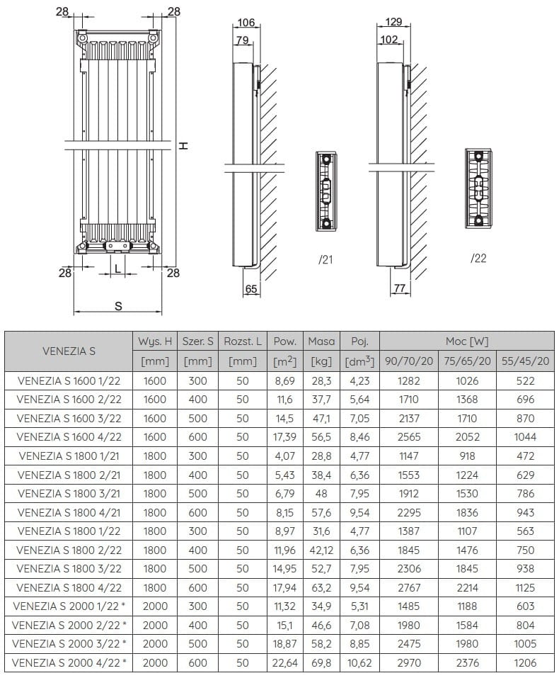 Pionowy grzejnik z serii Venezia S swój estetyzm zawdzięcza gładkiemu panelu czołowemu. Idealnie sprawdza się we wnętrzach eleganckich, z wysokimi oknami, a także do pomieszczeń modernistycznych. Wykonany jest ze specjalnej zimnowalcowanej blachy wg EN 422-1, wraz z osłonami bocznymi. Gładki dekoracyjny panel przykrywa przednią część grzejnika. Do wewnętrznych stron kanałów wodnych zgrzana jest blacha konwekcyjna.
