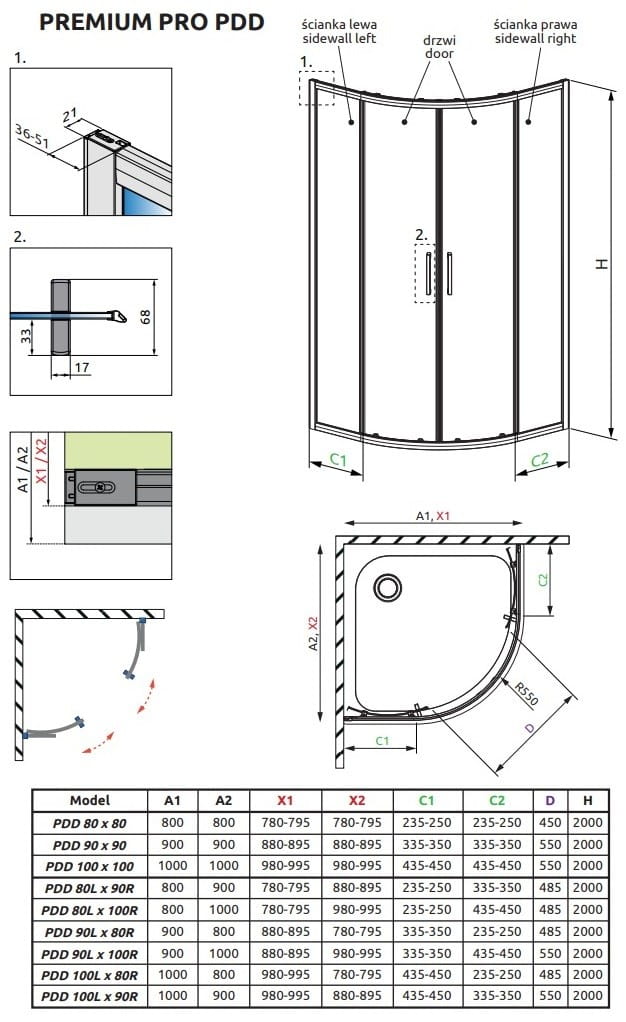 Kabina prysznicowa asymetryczna Radaway Premium Pro PDD 90x80x200 (zob. model PDD 90Lx80R na rysunku technicznym).