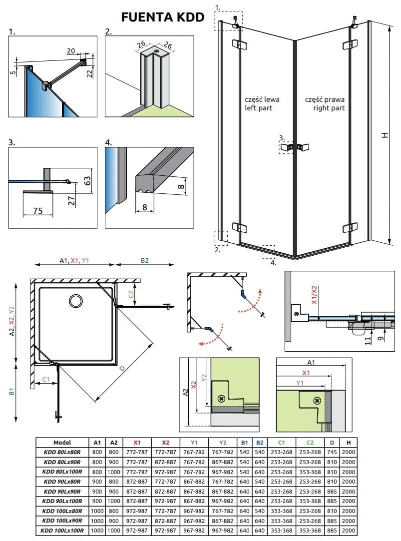 - Standardowo kabiny dopasowane są do montażu na brodziku o określonych wymiarach i właśnie te wymiary są podane w nazwie kabiny lub jej części. Rzeczywiste wymiary gabarytowe kabiny są nieco mniejsze od nominalnych podanych w nazwie artykułu. Jeśli planują Państwo montaż kabiny bezpośrednio na posadzce, proszę zwrócić uwagę na wymiary gabarytowe (X1, X2) oraz wymiary do osi szyby (Y1, Y2), które podane są na rysunku technicznym.