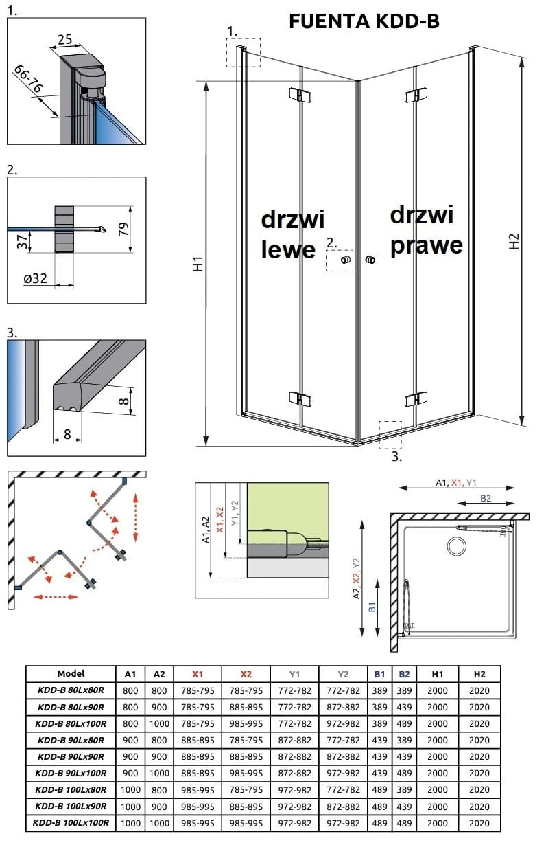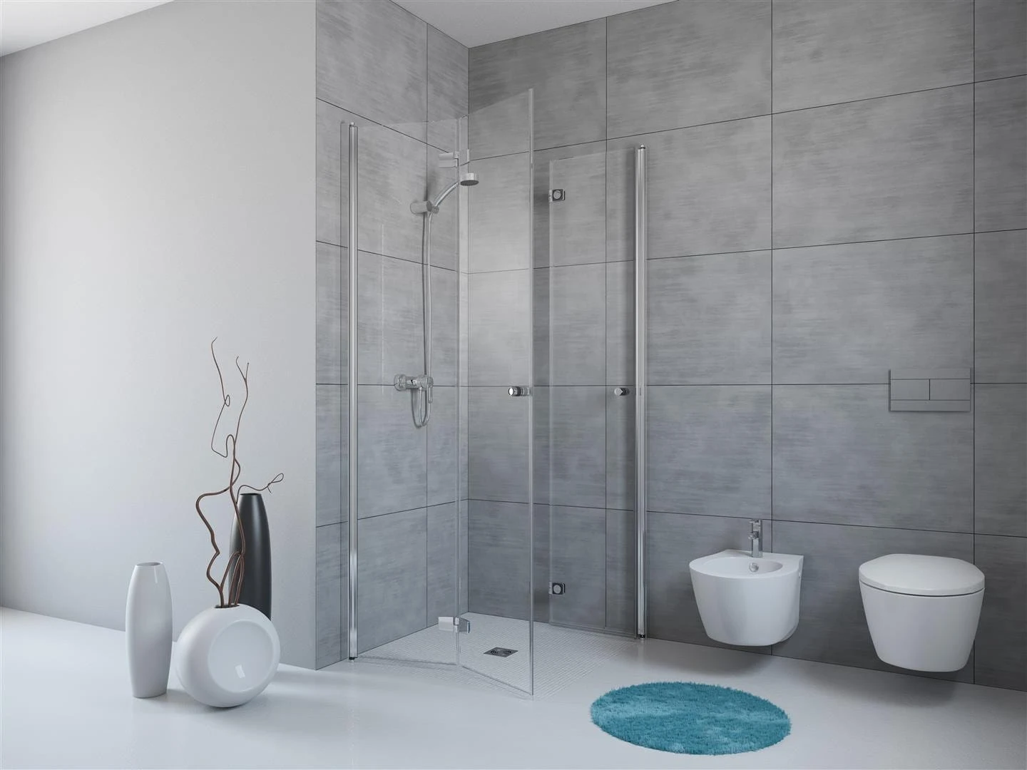 - Kabina dwudrzwiowa z drzwiami typu bifold składanymi do ściany.