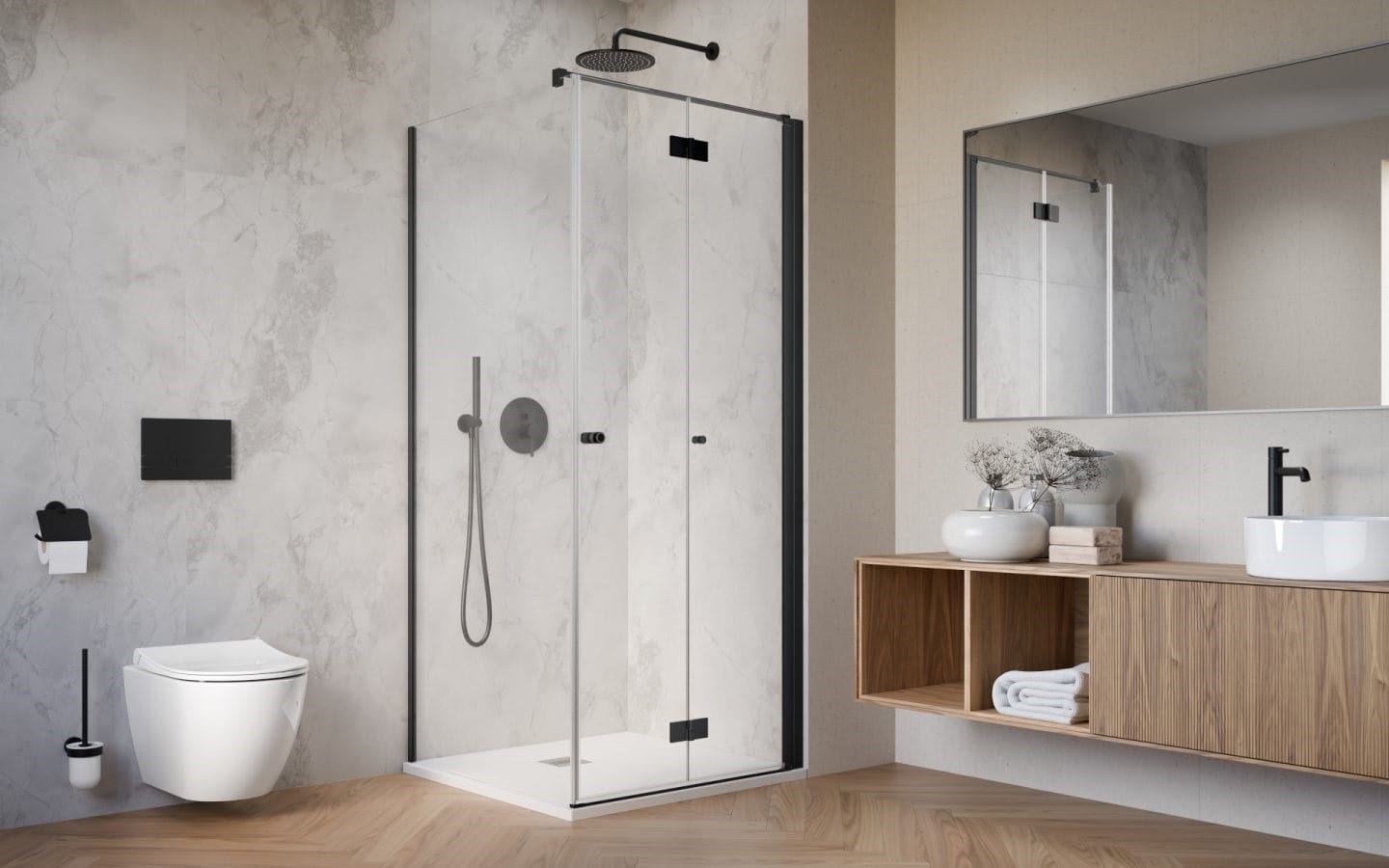 Kabina Nes 8 Black została stworzona z myślą o tych, którzy cenią sobie elegancję połączoną z minimalizmem. Czarne detale sprawiają, że kabina pięknie prezentuje się w każdym wnętrzu. Walory estetyczne to nie jej jedyne zalety. Jest pokryta powłoką Easy Clean mającą właściwości hydrofobowe, które sprawiają, że spływająca po szybach woda nie pozostawia osadów. Ułatwia to czyszczenie kabiny i oszczędza Państwu czas.