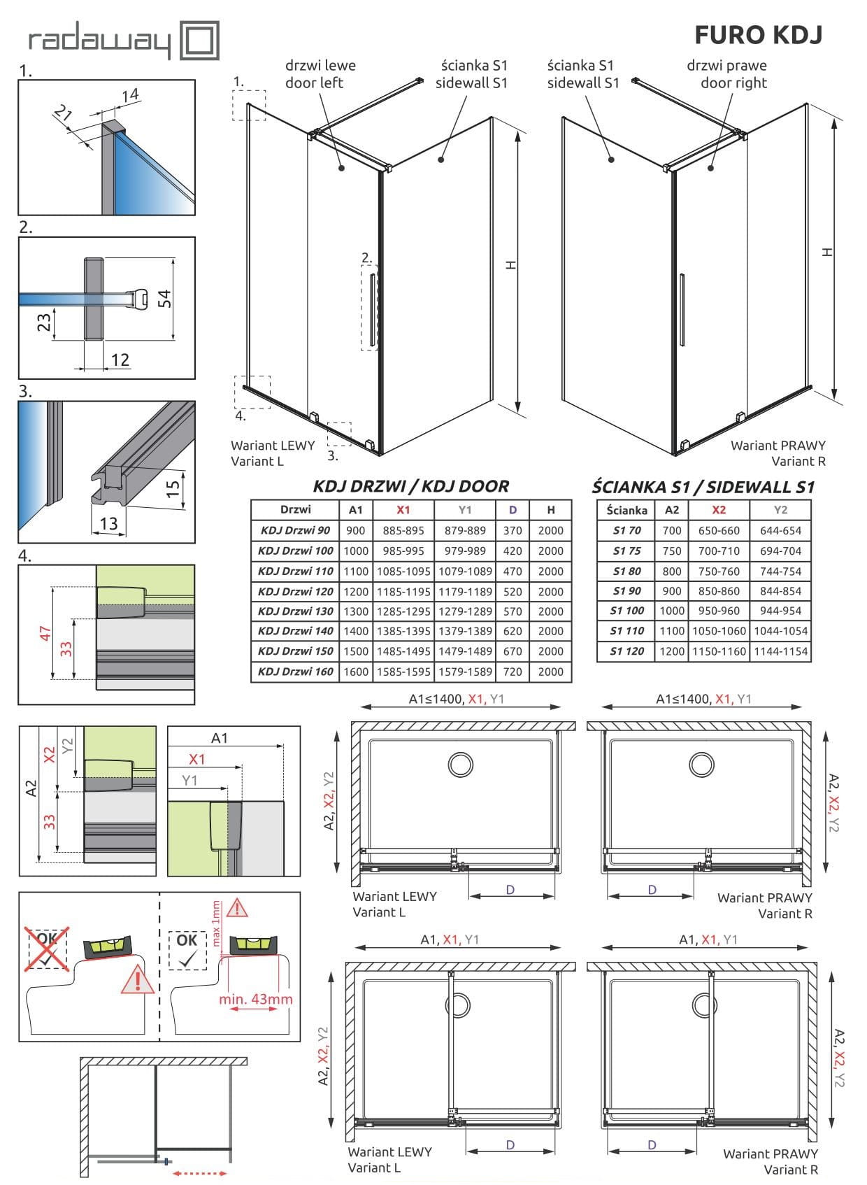 - Wymiar kabiny dopasowany jest do montażu na brodziku o standardowym rozmiarze. W rzeczywistości kabina jest mniejsza. Jeśli planują Państwo montaż kabiny bezpośrednio na posadzce, proszę zwrócić uwagę na wymiary do osi szyby (Y1, Y2), które podane są na rysunku technicznym.