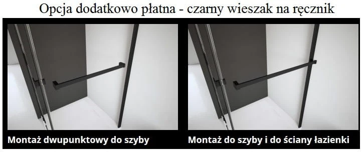 5) Kabina z wieszakiem na ręcznik montowanym na ściance bocznej obustronnie do szyby lub do szyby i ściany łazienki.