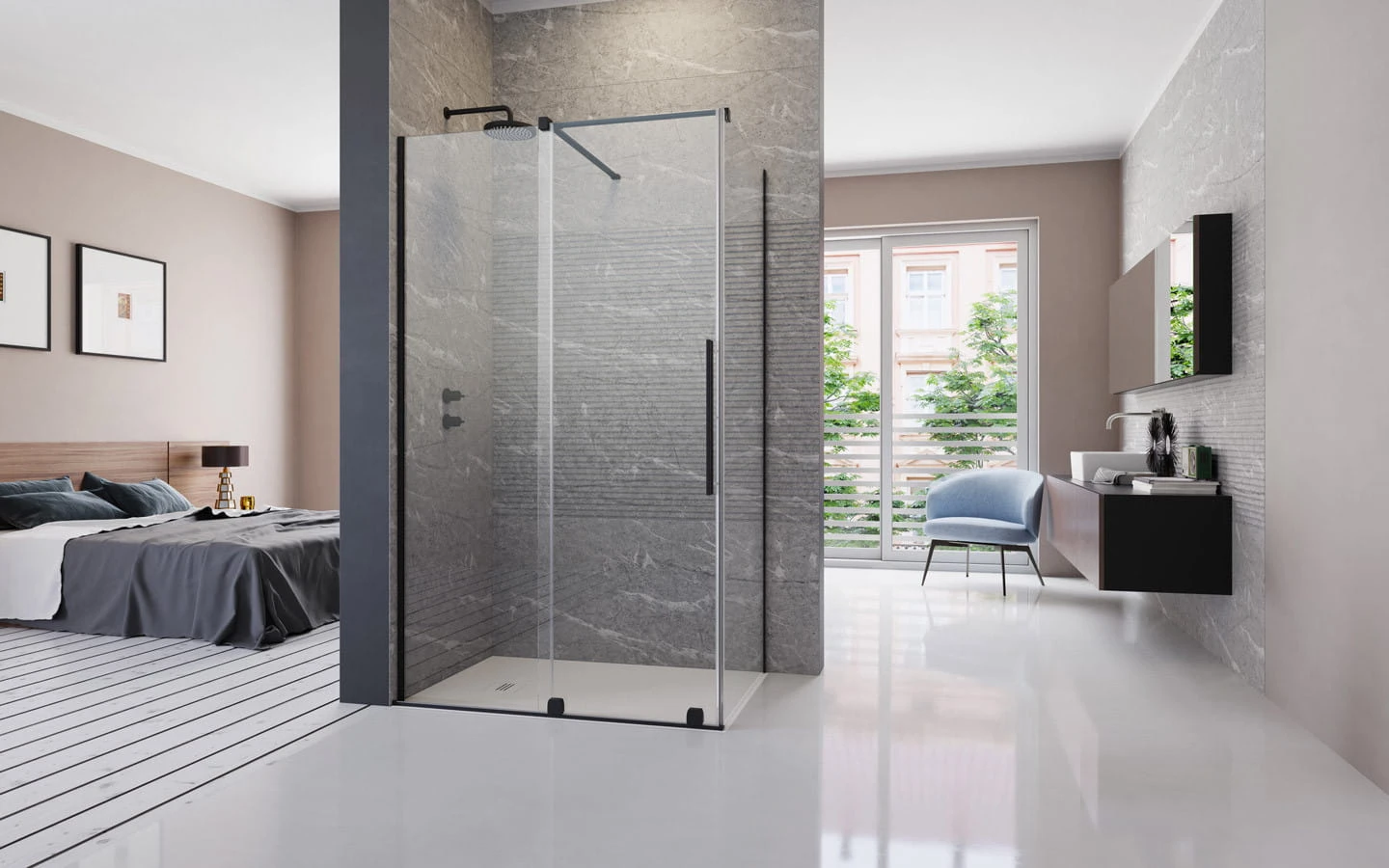 Seria Furo Black to niespotykana dotąd jakość wśród przesuwnych kabin prysznicowych. Dzięki rezygnacji z górnej prowadnicy i osadzeniu drzwi na rolkach uzyskaliśmy kabiny o niezwykłej elegancji, lekkości i przejrzystości. Rolki zostały zlicowane od wewnętrznej strony ze szkłem, ułatwiając utrzymanie kabiny w czystości. Przy otwarciu drzwi przesuwają się przed stały segment, dzięki czemu otrzymujemy przestronne i wygodne wejście.