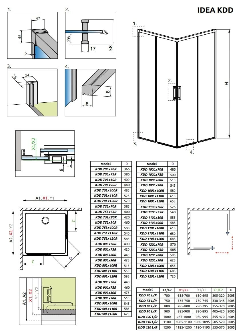 UWAGA! Standardowo kabiny dopasowane są do montażu na brodziku o określonych wymiarach i właśnie te wymiary są podane w nazwie kabiny lub jej części. Rzeczywiste wymiary gabarytowe kabiny są nieco mniejsze od nominalnych podanych w nazwie artykułu. Jeśli planujesz montaż kabiny bezpośrednio na posadzce, zwróć uwagę na wymiary gabarytowe (X1, X2) oraz wymiary do osi szyby (Y1, Y2), które podane są na rysunku technicznym.