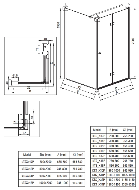 - Kabina składa się z drzwi składanych i ścianki bocznej