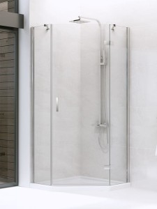 Kabina prysznicowa pięciokątna z pojedynczymi drzwiami uchylnymi na zewnątrz. Doskonałe rozwiązanie dla posiadaczy niewielkiej łazienki dzięki ściętej linii drzwi.