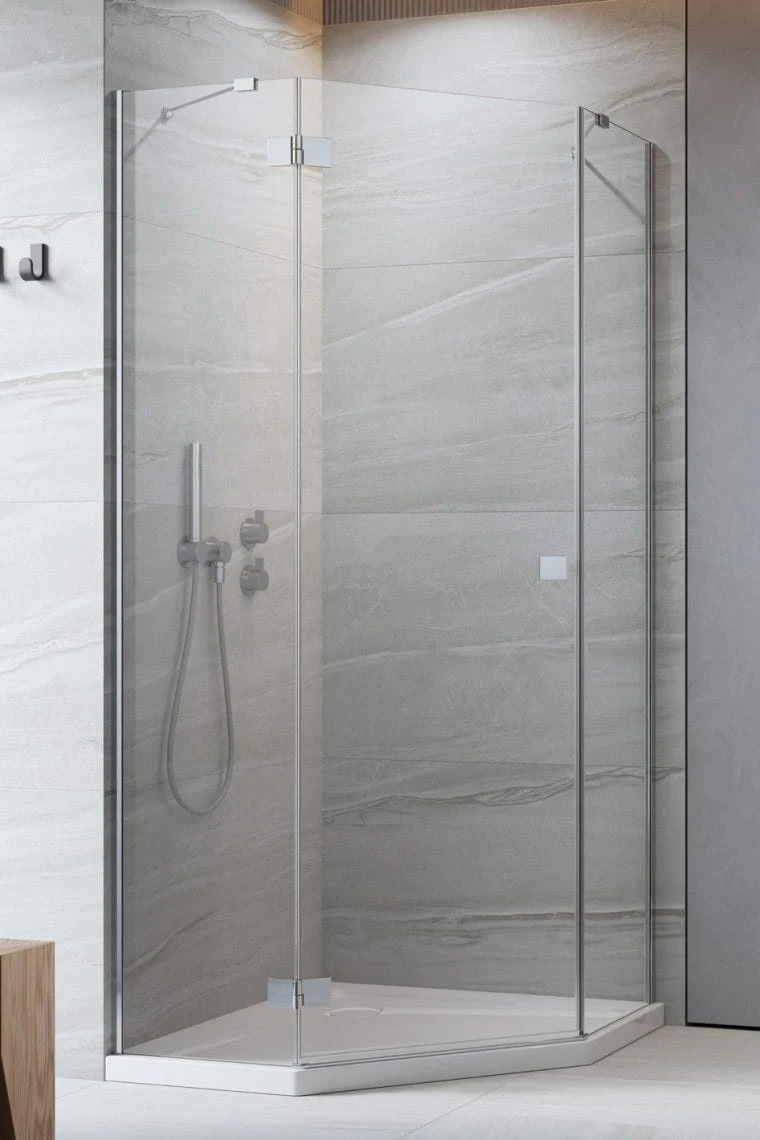 Kabina prysznicowa pięciokątna Essenza PTJ firmy Radaway z drzwiami uchylnymi na zewnątrz. Szkło przejrzyste o grubości 6 mm pokryte powłoką Easy Clean.