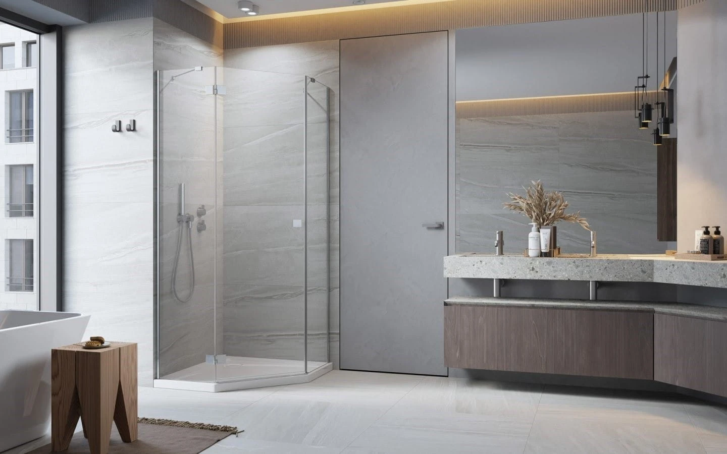 Kabina prysznicowa pięciokątna Essenza PTJ firmy Radaway z drzwiami uchylnymi na zewnątrz. Szkło przejrzyste o grubości 6 mm pokryte powłoką Easy Clean.
