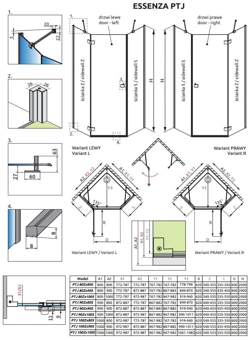 - Standardowo kabiny dopasowane są do montażu na brodziku o określonych wymiarach i właśnie te wymiary są podane w nazwie kabiny lub jej części. Rzeczywiste wymiary gabarytowe kabiny są nieco mniejsze od nominalnych podanych w nazwie artykułu. Jeśli planują Państwo montaż kabiny bezpośrednio na posadzce, proszę zwrócić uwagę na wymiary gabarytowe (X1, X2) oraz wymiary do osi szyby (Y1, Y2), które podane są na rysunku technicznym.