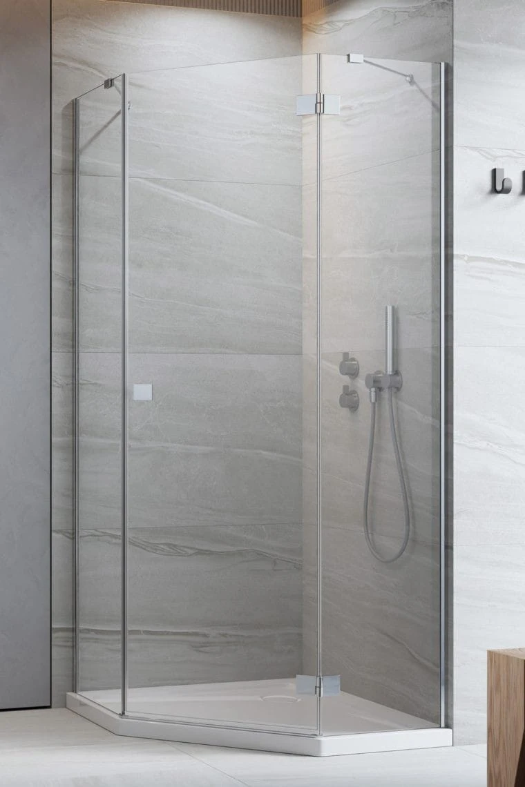 Kabina prysznicowa pięciokątna Essenza 8 PTJ firmy Radaway z drzwiami uchylnymi na zewnątrz. Szkło przejrzyste o grubości 8 mm pokryte powłoką Easy Clean.