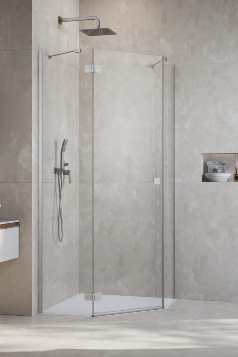 Kabina prysznicowa pięciokątna Essenza 8 Brushed Nickel PTJ firmy Radaway z drzwiami uchylnymi na zewnątrz. Szkło przejrzyste o grubości 8 mm pokryte powłoką Easy Clean.