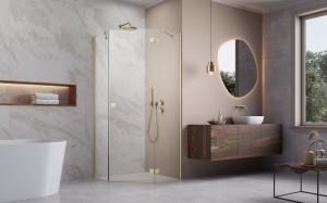 Kabina prysznicowa pięciokątna Essenza 8 Brushed Gold PTJ firmy Radaway z drzwiami uchylnymi na zewnątrz. Szkło przejrzyste o grubości 8 mm pokryte powłoką Easy Clean.