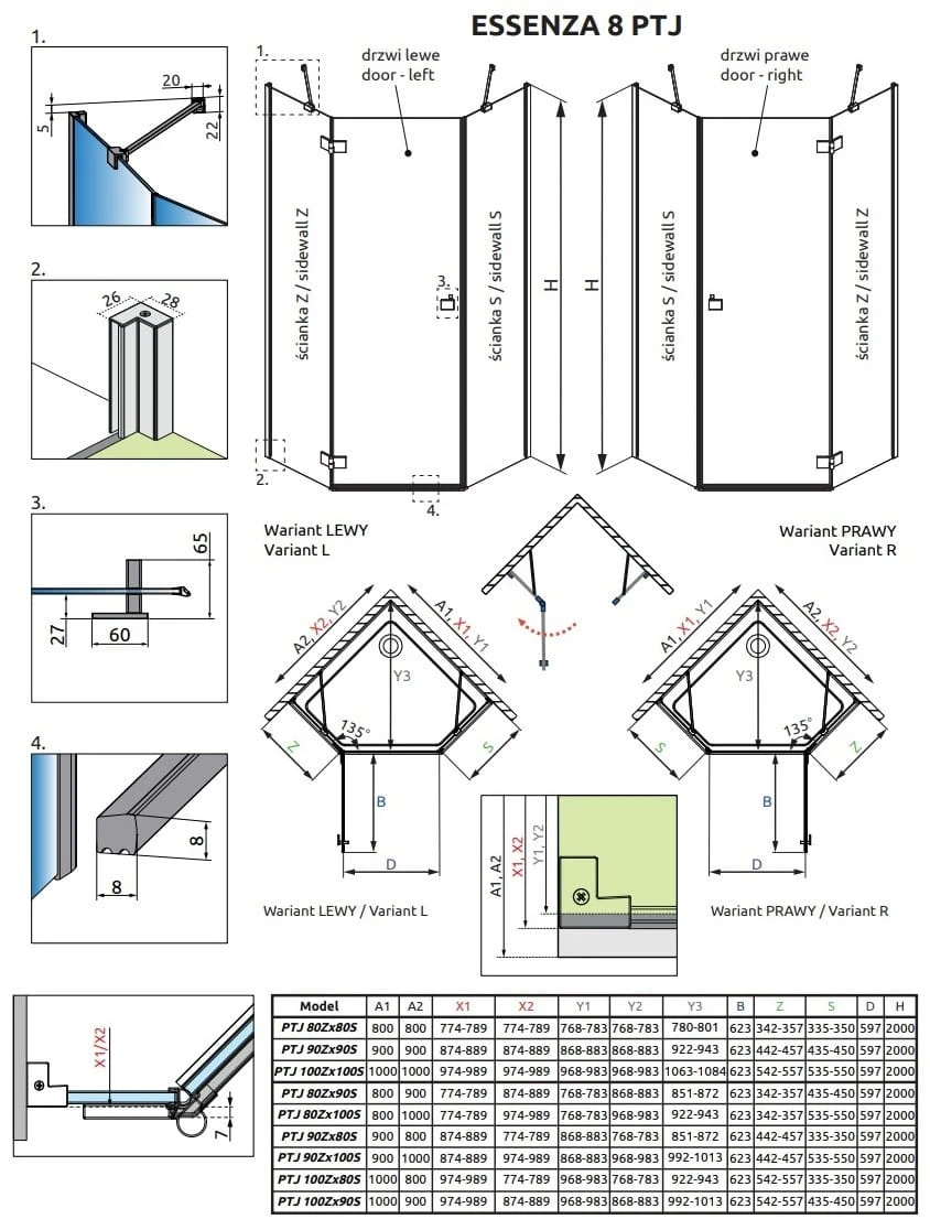 - Standardowo kabiny dopasowane są do montażu na brodziku o określonych wymiarach i właśnie te wymiary są podane w nazwie kabiny lub jej części. Rzeczywiste wymiary gabarytowe kabiny są nieco mniejsze od nominalnych podanych w nazwie artykułu. Jeśli planują Państwo montaż kabiny bezpośrednio na posadzce, proszę zwrócić uwagę na wymiary gabarytowe (X1, X2) oraz wymiary do osi szyby (Y1, Y2), które podane są na rysunku technicznym.
