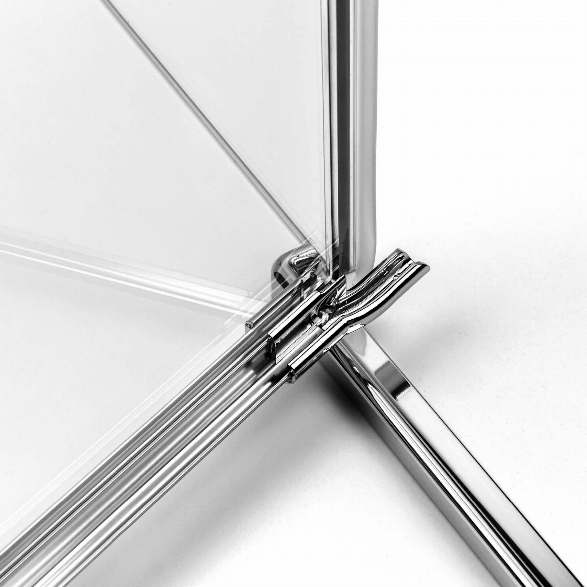 Kabina Eventa posiada eleganckie, błyszczące chromowane detale. Kabina została wyposażona w bezpieczne, hartowane szyby o grubości 8mm, z powłoką ochronną Active Shield 2.0.