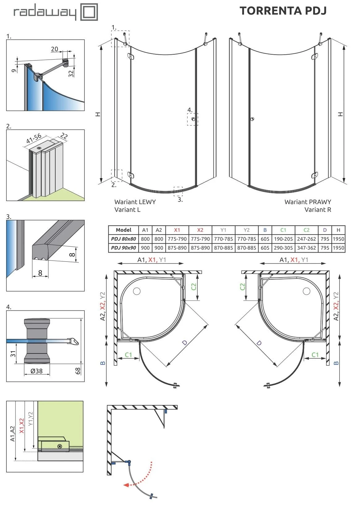 - UWAGA! Wymiar kabiny dopasowany jest do montażu na brodziku o standardowym rozmiarze. W rzeczywistości kabina jest mniejsza. Jeśli planują Państwo montaż kabiny bezpośrednio na posadzce, proszę zwrócić uwagę na wymiary do osi szyby (Y1, Y2), które podane są na rysunku technicznym.