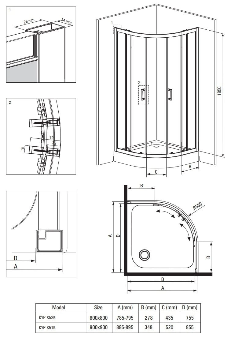- Promień łuku 550 mm
