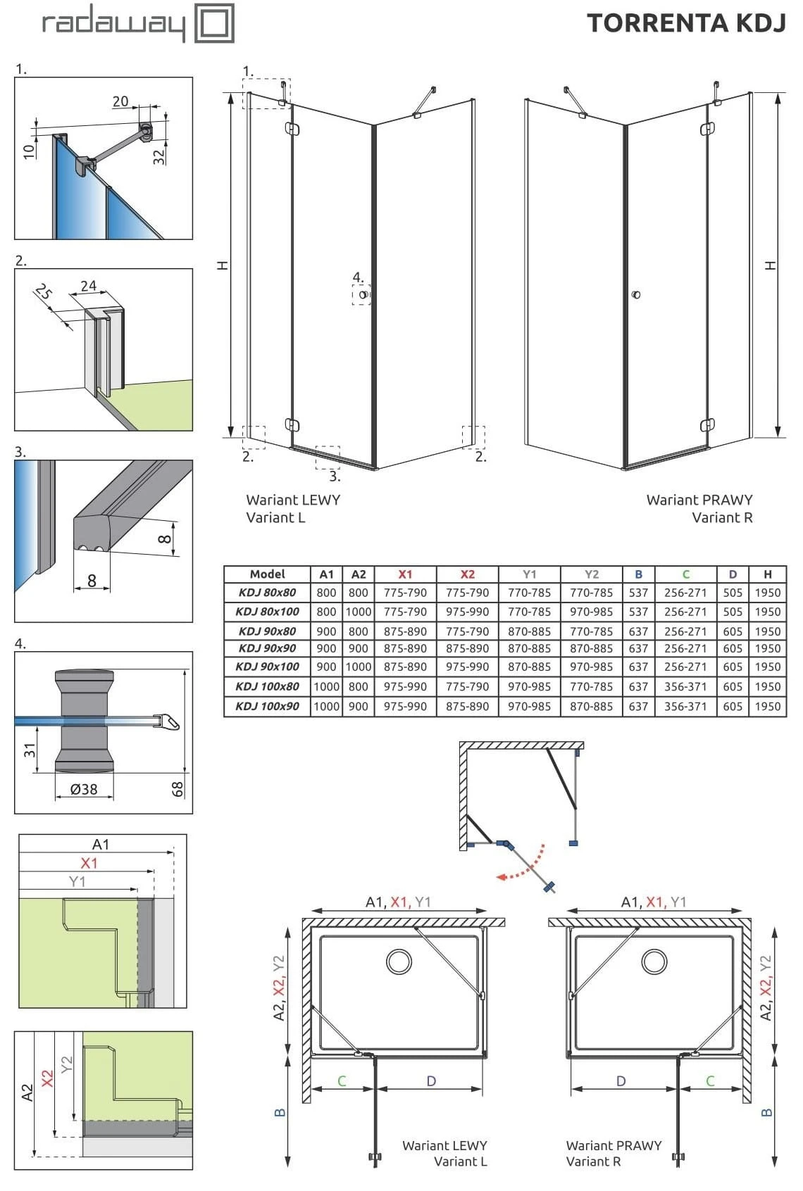 - Wymiar kabiny dopasowany jest do montażu na brodziku o standardowym rozmiarze. W rzeczywistości kabina jest mniejsza. Jeśli planują Państwo montaż kabiny bezpośrednio na posadzce, proszę zwrócić uwagę na wymiary do osi szyby (Y1, Y2), które podane są na rysunku technicznym.