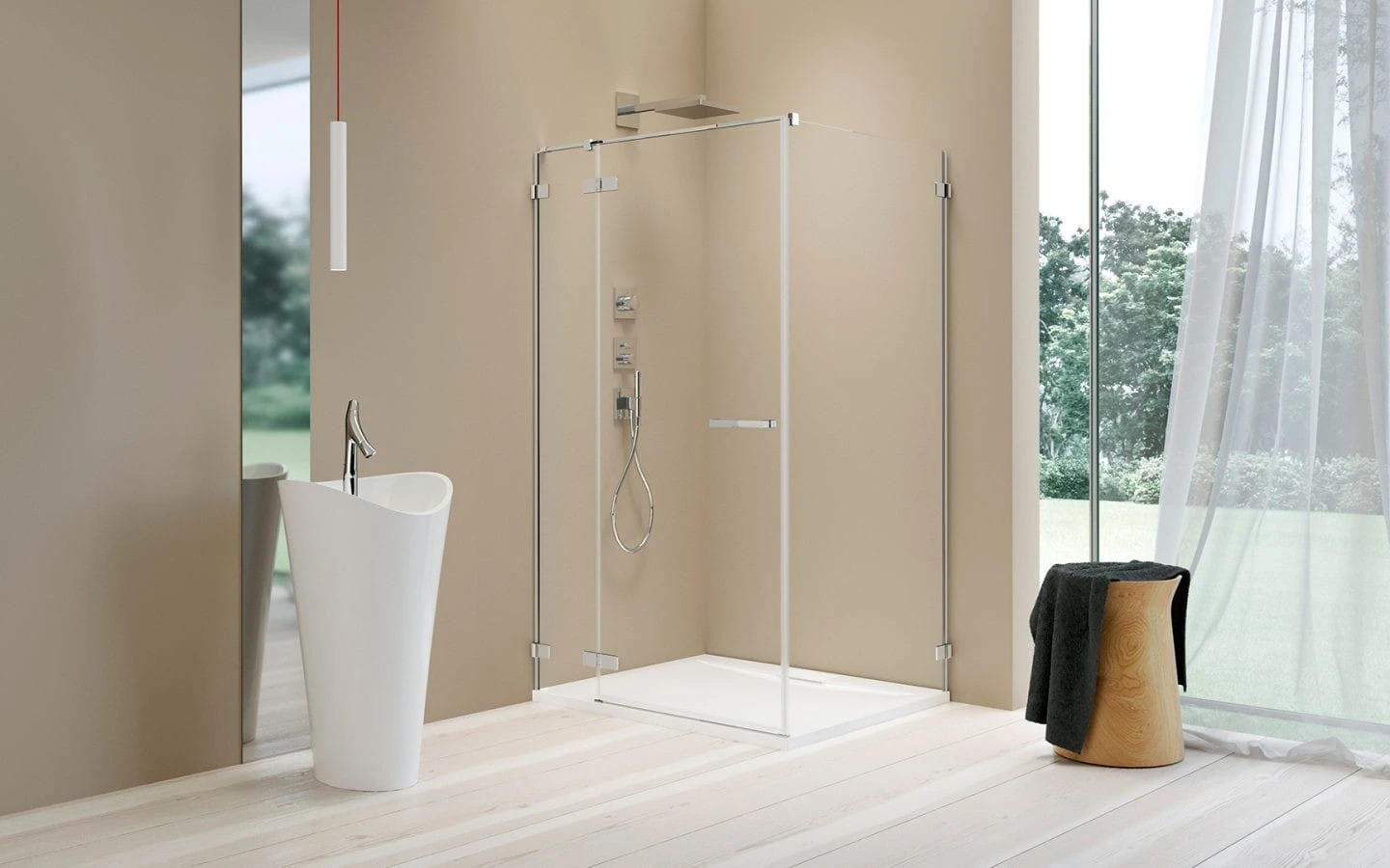 - Zawiasy wahadłowe oraz klamry mocujące zostały zlicowane z taflą szkła – jednolita powierzchnia ułatwia utrzymanie kabiny w czystości.