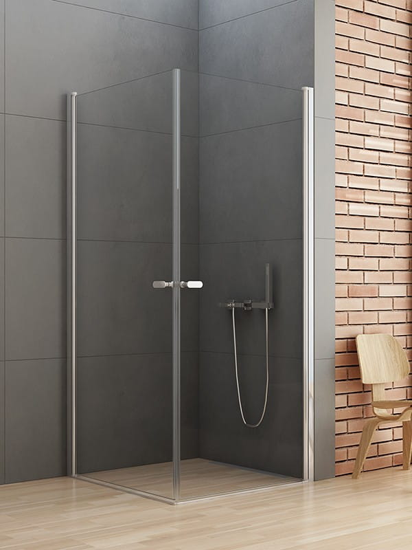 Kabina prysznicowa z podwójnymi drzwiami uchylnymi otwieranymi na zewnątrz i do wewnątrz. Zawias kolumnowy zastosowany w drzwiach NEW SOLEO zapewnia niezwykle szerokie wejście.