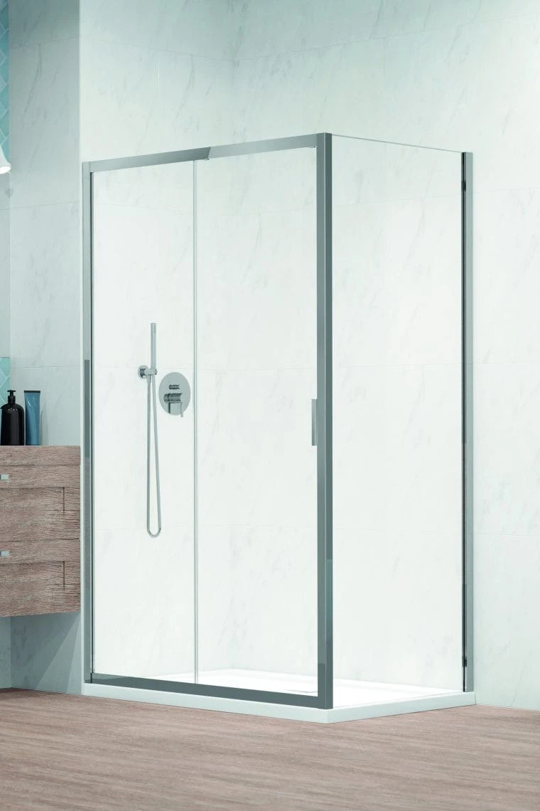 - Przedmiotem sprzedaży jest kabina prysznicowa z drzwiami przesuwnymi w szkle przejrzystym bez brodzika.
