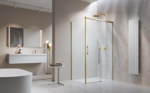 Kabiny Idea Brushed Gold KDJ to wynik designerskiego połączenia szkła z eleganckimi detalami w kolorze szczotkowanego złota – doskonale sprawdzą się we wnętrzu o minimalistycznym stylu , ale równie harmonijnie będą współgrać ze stylem klasycznym. Są to kabiny dla osób ceniących dobry design, które preferują geometryczne formy składające się w proporcjonalną całość.
