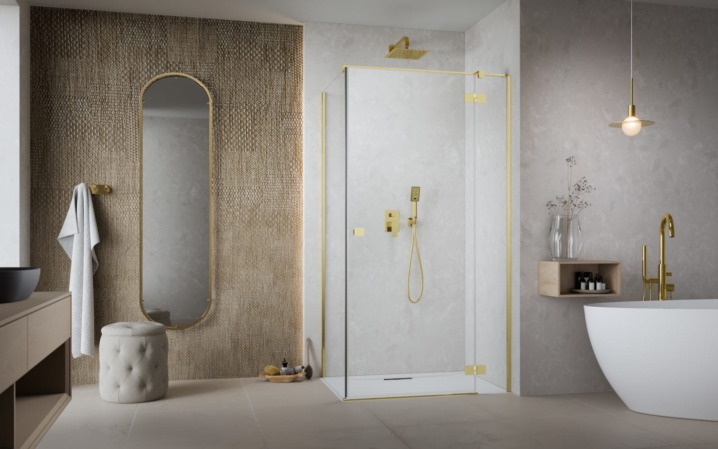 Kabiny Essenza Gold KDJ zostały zaprojektowane zgodnie z najnowszymi trendami w designie. Połączenie tafli szkła o grubości 6 mm ze złotymi detalami daje efekt lekkiej i estetycznej kabiny.