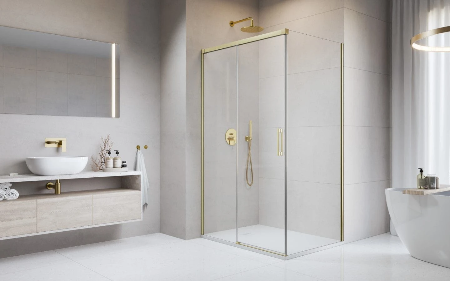 Kabiny Idea 8 Brushed Gold KDJ to wynik designerskiego połączenia szkła o grubości 8 mm z eleganckimi detalami w kolorze szczotkowanego złota – doskonale sprawdzą się we wnętrzu o minimalistycznym stylu , ale równie harmonijnie będą współgrać ze stylem klasycznym. Są to kabiny dla osób ceniących dobry design, które preferują geometryczne formy składające się w proporcjonalną całość.