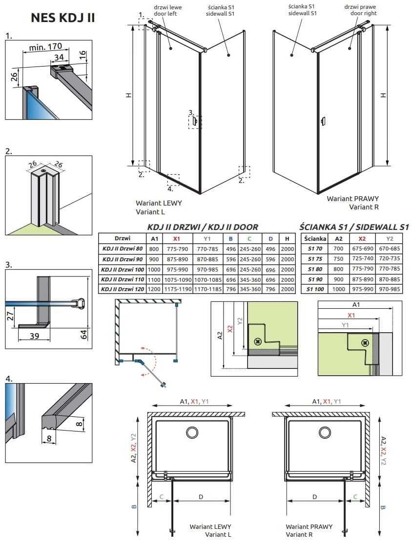 - Standardowo kabiny dopasowane są do montażu na brodziku o określonych wymiarach i właśnie te wymiary są podane w nazwie kabiny lub jej części. Rzeczywiste wymiary gabarytowe kabiny są nieco mniejsze od nominalnych podanych w nazwie artykułu. Jeśli planują Państwo montaż kabiny bezpośrednio na posadzce, proszę zwrócić uwagę na wymiary gabarytowe (X1, X2) oraz wymiary do osi szyby (Y1, Y2), które podane są na rysunku technicznym.